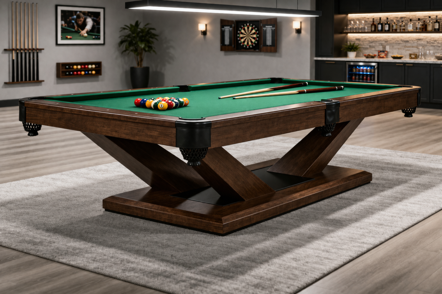 An elegant, robust crisscross leg design that acts as a beautiful centerpiece for any game room.